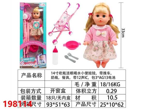 14寸吹瓶活眼喝水小便娃娃,带铁推车,奶瓶,餐具